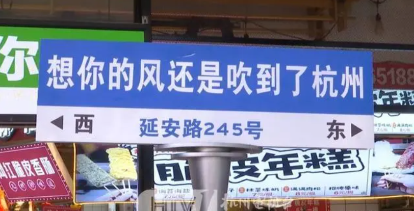 各个城市里最近,越来越多出现了浪漫风系列路牌,它们既没有文化底蕴,也没有任何实际的指示作用。相同的蓝白配色,底部写着坐标和指示方向,中间是高度相似的文案:我在XX很想你、我在XX等你很久了、想你的风还是吹到了XX……
