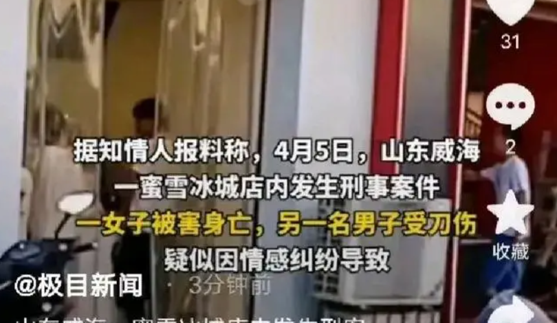 在清明节,山东威海又发生一起刑事命案。一家蜜雪冰城店里一名女子被害,一名男子受刀伤。女子与受伤男子都是黑龙江人,在韩乐坊蜜雪冰城店里打工。