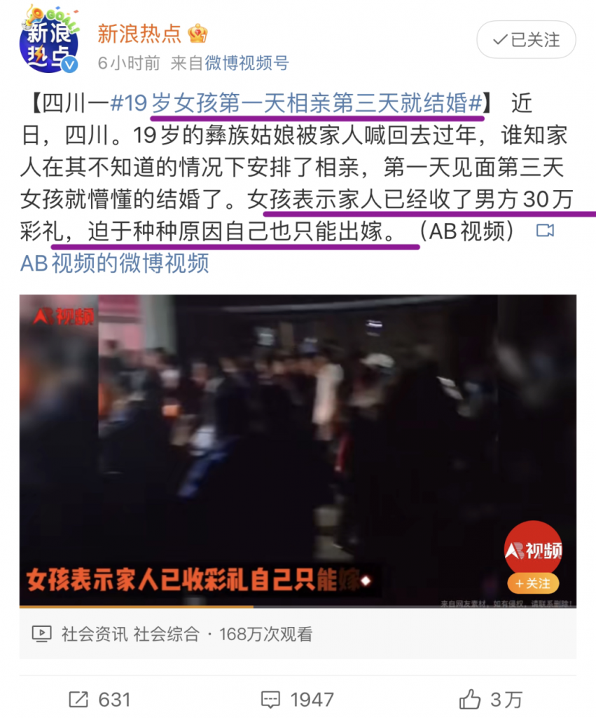 四川一个姑娘三天时间就把自己的人生大事办了!简直是闪婚。从女孩的态度表明了对于这个婚姻是不很满意的,而且很懵圈,但是由于“种种原因”只好嫁了,毕竟男方给了女孩家人30万彩礼。网友调侃,“做生意就做生意”,有人觉得这个就是悲剧的开始。物质进步,思想三观却原地踏步。