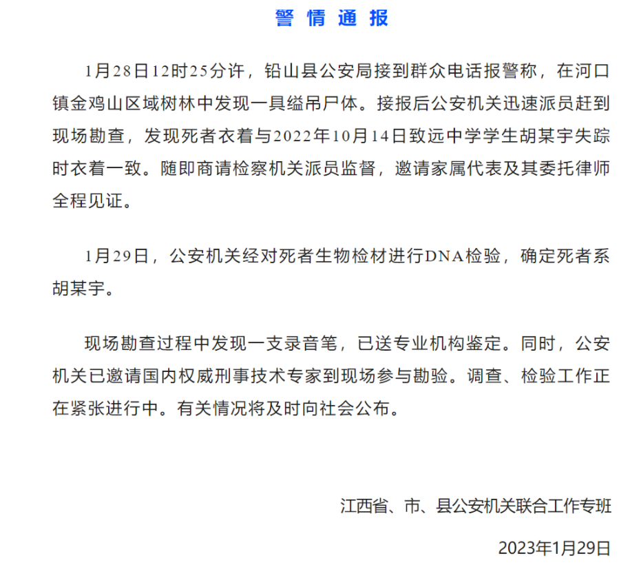 据江西警方通报,在1月28日,有群众电话报警称在河口镇金鸡山区域树林中发现一具缢吊尸体。警方很快就赶到现场勘查,而令人心头一颤的是,死者的衣着竟然与2022年10月14日某高中学生胡鑫宇失踪时衣着一致,现场还发现一支录音笔。翌日,公安机关对死者进行DNA检测,最终确定死者确实就是胡鑫宇。辛辛苦苦养大,又辛辛苦苦找了106天的儿子,如今却阴阳两隔。