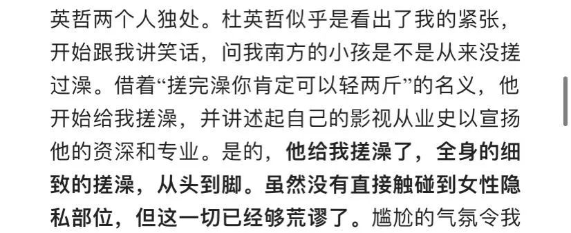 而且是从头搓到脚,极其“细致”。以及强行拥抱,亲吻女生,多次询问她们是不是处女之类的私密问题。尤为夸张的是,有一名17岁的女生被威逼利诱着不仅和杜英哲发生了关系,还生下了他的孩子!女生因此中断了学业。但在绝对的强权压制和精神操控下,她们甚至不敢判定,这到底是不是性侵。