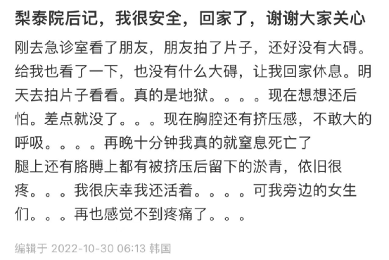 许安安伸着脖子呼吸,她告诉自己,要活下去,“只有这一个念头坚持了下来。”梨泰院是首尔有名的繁华区,地位相当于北京的三里屯。但那里不是广场,而是比较窄的步行道。梨泰院附近有很多酒吧、餐馆、商店,是有名的特色街区,会举办“僵尸跑”活动,亦有节日庆演。