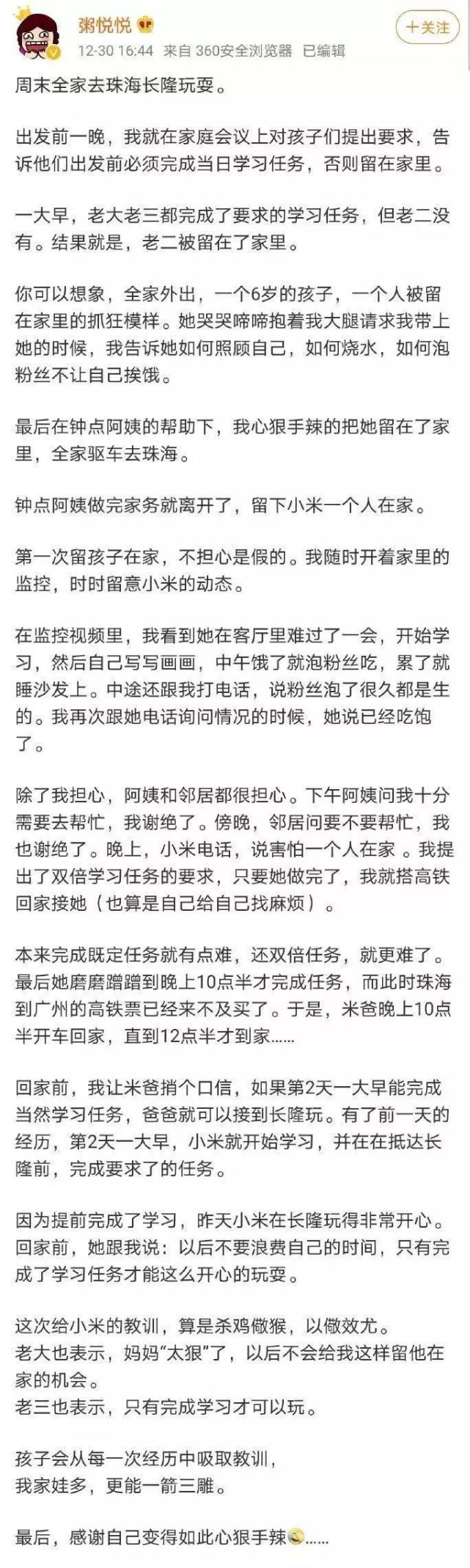 因为二女儿小米没完成自己给她布置的学习任务,为了惩罚她,这位母亲就做出了让人惊掉下巴的奇葩举动:带着其他两个孩子出去游玩,把6岁的小米独自扔在家里做作业,自己烧水泡粉丝吃。期间,小米多次打电话告诉她:“自己在家里过夜很害怕”、“粉丝怎么泡都泡不熟”,而这位母亲是怎么反应的呢?她提出:你必须完成双倍的学习任务,我才同意让爸爸去接你。到这个时候了,她满脑子想的还是只有让孩子学习。一个6岁孩子,还不具备自立更生的能力,放她一个人在家里,磕到碰到还算小事,万一在烧水的过程中被开水烫到怎么办?万一不小心碰到家里的燃气插座出事怎么办?她把这样的育儿方法分享出来,还觉得自己做得不错,粉丝还一片叫好,当做教育模板,这才是最可怕的。