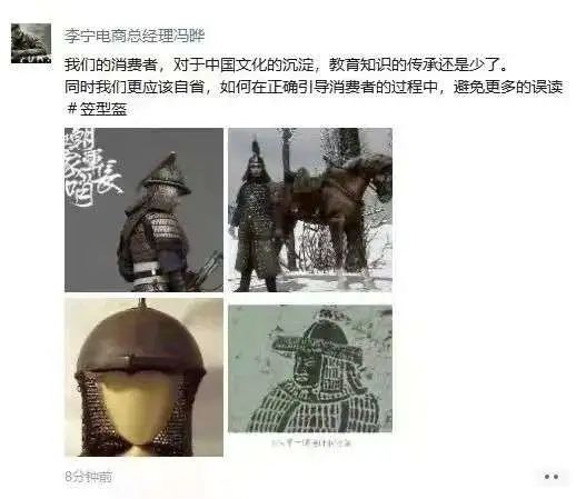 紧接着,有网友扒出李宁的现任CEO钱炜,是日籍华人。钱炜,1971年在中国出生,1990年赴日留学,毕业于日本关西大学,之后,他加入了日本国籍,并改名高坂武史。“神似日本军服”“CEO是日籍华人”“曾是优衣库高管”……这种种关联,让很多网友猜测,这次李宁日系化设计,难道是钱炜“夹带私货”的行为?事件这几天迅速发酵。但李宁官方并没有第一时间做出回应。倒是李宁公司的电商总经理发了条朋友圈。一条火上浇油的朋友圈。他表示,这种新款衣服的帽子,其实是我们古代就有的“笠型盔”。然后说:“我们的消费者,对于中国文化的沉淀,教育知识的传承还是少了。同时我们更应该自省,如何在正确引导消费者的过程中,避免更多的误读。”这段话,让人感觉是在抱怨消费者不懂历史,误读了他们的创意。