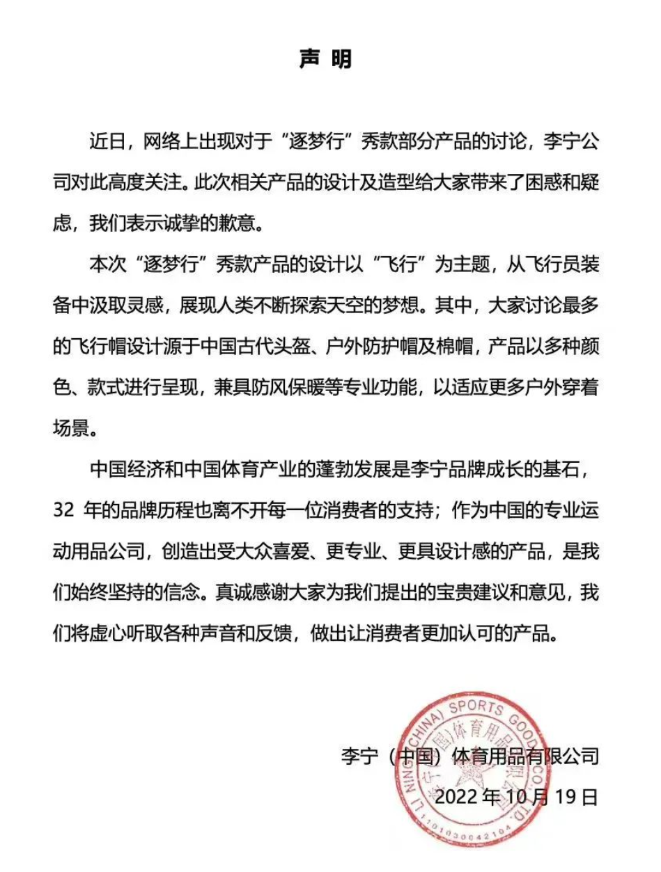 网友开始吐槽:海天说他符合国标。小泉说我不会用刀。李宁说我文化不高……第一,古代的笠型盔不是绿色的。第二,你们既然要考虑历史,就不能只看古代史,不看近代史。近代史对老百姓的影响才是最大的。第三,近代那一段屈辱的历史,在老百姓心里的烙印,你们民族品牌不是应该格外清楚吗?短短三天,李宁股市遭遇巨大动荡,市值凭空蒸发123亿元。李宁损失惨重,这才反应过来他们真的踩雷了,紧急声明道:从飞行员装备中汲取灵感,展示人类探索天空的梦想……设计源于中国古代头盔、户外防护帽及棉帽,产品以多种颜色和款式进行呈现,以适应更多户外穿着场景......