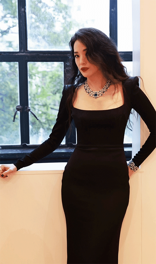 女性的优雅,来自独立,服饰的优雅,来自自由。当一个人选择了自己喜欢的服饰,实际上更是选择自己喜欢的那种生活。黑色修身礼服搭配绿宝石项链,烈焰红唇明眸皓齿……