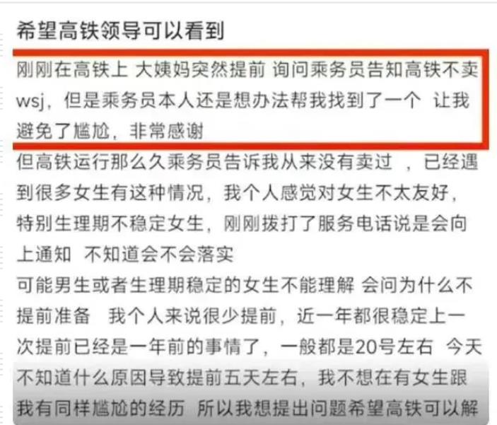 前几天,有位网友在社交平台讲述了自己在乘坐高铁时的一件遭遇。自己月经提前,在高铁上未能买到卫生巾,最后还是求助乘务人员才辗转找到了一个。思来想去,为了避免今后更多的女性遇到和自己同样尴尬的处境,这位网友便发文提出诉求,建议高铁能够售卖卫生巾。