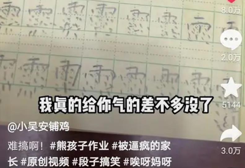 出现在镜头中的吴先生,看起来很生气。“我辛辛苦苦赚钱,你看老师写这个‘飞’字是怎么写的,再看你写的都飞起来了。”“这‘雨’越下越大,是雷雨还是暴雨?”吴先生望着儿子说。一个作业本上第一页的空格里满是“飞”字,第一行还正常,后面的“飞”字就逐渐变形,有的甚至变成了横卧式,有的看起来像蚊子或鸟。第二页的空格里满是“雨”字,第一行正确,后面的“雨”字从四点逐渐变成多点。