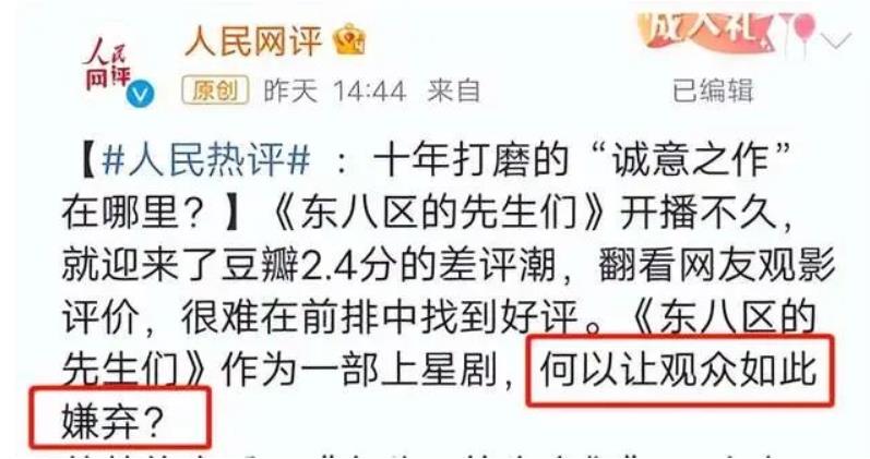 也是因此,该剧自开播后骂声不断,评分更是直接降到了2.2分,堪称史上最低分。就连官媒“人民网评”也坐不住了,发文斥责该剧的剧情过于油腻、悬浮、尴尬。并直言“俗套”和“脱离现实”永远不可能成为卖点。人民网评发表的剧评,文章的标题就发出灵魂拷问——所谓的十年磨一剑的“诚意之作”在哪里?