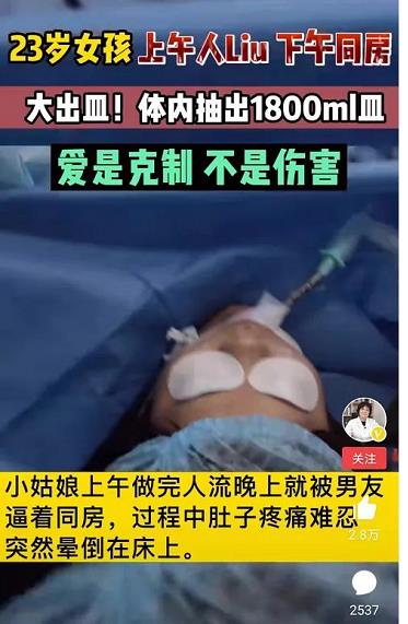 女孩并非自愿发生关系,严肃点说,这完全算是强奸。当时女孩拒绝男友请求后,见哄骗不奏效的渣男又开始情感绑架。就这样,女孩思想斗争失败,屈服了男友。结果就发现了新闻里的一幕:女孩在途中腹痛难忍,直接晕倒。由于刚做完手术,子宫内膜里的血管是打开状态,剧烈运动会刺激子宫收缩,造成大出血。刚出院,又要挨一刀。无套怀孕;狠心打胎;术后性生活……这些赤裸裸的渣男行径女孩竟照单全收,男友的理由更是炸碎三观:“不给就是不爱我!”“这时候最不容易怀孕。”爱自己是终生浪漫的开始,这并非热血鸡汤,也绝非一句空话,像这位23岁为满足爱人委屈的单纯女孩并不在少数。但即便是情侣或夫妻,就必须答应上床的请求吗?就要满足对方无理的诉求吗?不