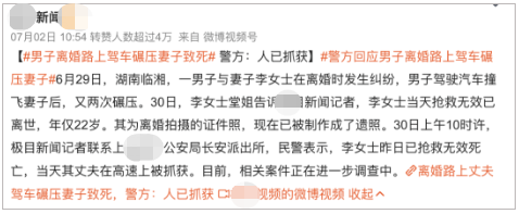 像热评中的网友说的,这是“反复碾压”。当时有人把已经倒地的女子拖到旁边,以为这个地方应该安全了。没想到,男子却追过去碾,为此甚至不惜把女子后面的车一起撞出去。可以看到,在反复碾压中,车轮似乎染上了颜色,车痕在地上画了几个圈。他就这样一次次绕着圈从女子身上碾过。种种行为中,都透出一种掩饰不住的疯狂。根据后来的通报,这两人本是“情侣关系”。可在短短的视频中,透出的只有仇恨。阿德勒曾说过,"自卑能毁灭你,也能成就你。超越自卑,你将成为内心强大的自己”。面对人生中突如其来的不幸与变故,我们需要学会理解和接纳。当我们开始接受自己的不完美,理解"人生不如意之事十有八九”时,我们便能以-种坦然的心态,面对生命中突如其来的变故。只有发自内心地认可自己,才能让自己不幸的阵痛后得以疗愈。才能挣脱舆论的枷锁,拥有爱自己与别人的能力。这件事让我想起一个多月前的一个案件,犯案过程有很多相似之处。湖南某市,6月29日。那是一对夫妻,他们本来已经协商好,一起去办离婚。但是到了民政局,却由于丈夫的户口问题没办下来。万万没想到,离开民政局后,丈夫却开着车朝妻子撞过去,把妻子撞出数米远后,又反复在妻子身上碾过。后来妻子同样抢救无效,去世了。这位妻子年仅22岁,刚到法定的结婚年龄,他们还育有2个孩子。