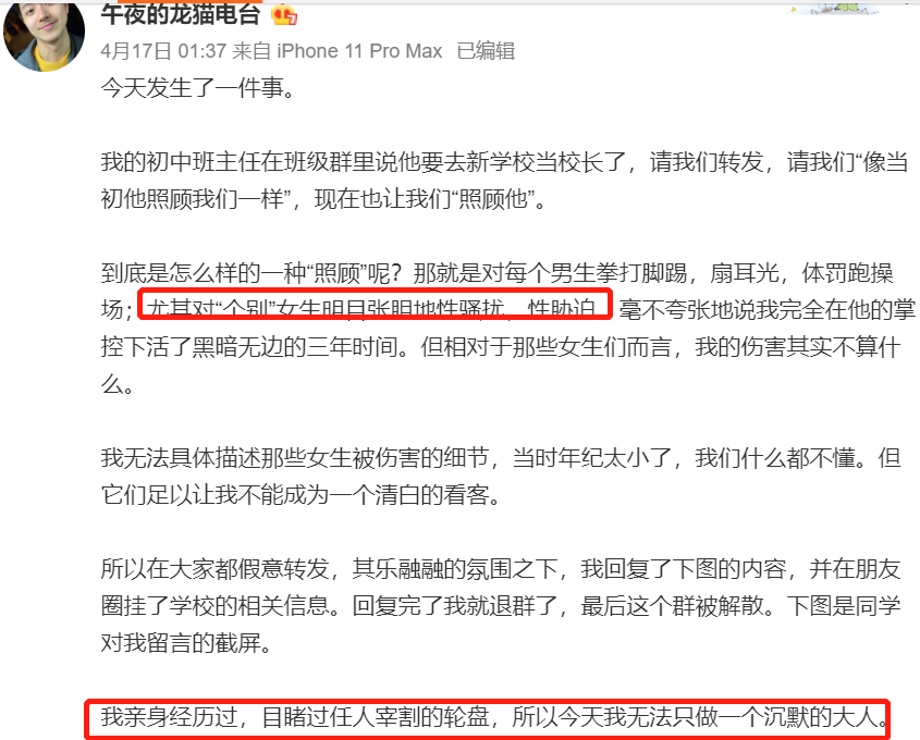 一名网友午夜(简称)最近在自己的中学群里,发现当年自己的班主任要去新学校当校长了,希望大家能够多多照顾。群里其他人对此消息的回复都非常客套,但他坐不住了:这位老师在他当年读书时,经常对男学生拳打脚踢、扇耳光、体罚;对一些女生明目张胆地性骚扰、性胁迫,这样的人,凭什么继续教书育人,还要当校长培育下一代?不久后,午夜收到了不少当初的同学发来的微信。当年的孩子们,都是年近三十的大人了。有的懦弱、有的冷漠,有的圆滑世故到没有原则,有看热闹的,有谢谢他替当年自己出口气的,还有人指责他说话欠考虑的...最让午夜惊讶的,是除了自己当时就知道的几个受害女学生外,还有这么多人被他骚扰,现在看到自己发声,才有勇气说出来...看过了衣着光鲜的不堪“教兽”后,我们更加感谢张鹏程校长、张桂梅校长……“白发校长”张鹏程,“苍老”的他却是一个“八零后”。他主动申请相关政策扶持,自掏腰包垫付了十几万,为的是让学校旧貌换新颜。学校缺老师,他就一人分饰多个角色,英语、数学、体育,校长一人担起,食堂厨师不小心扭了腰,他又变身为食堂大师傅,颠勺炒菜。这群穷孩子们正在长身体,不能缺营养,“校长爷爷”就想尽一切办法,把自己可以支配的私房钱全部用来给孩子们买水果和肉蛋,隔三差五还会加餐……身上那件衣服,一穿就是十几年,很多地方都已磨破,可他始终不换新衣。孩子们更不知道,满头白发的“校长爷爷”还不到40岁……世事多艰,“孤勇者”的逆袭给人奋进的勇气,而张桂梅率领的华坪女高就是那群“孤勇者”。自2008年建校以来,已经有近2000名女孩从华坪女高走出了大山,她放弃了本可优渥的生活,只为这一代的女孩们不再“受困”。“高附加值教师”对学生的影响力是正面的、重要的、长期的。韩愈《师说》曰:“师者,所以传道授业解惑也。”但张桂梅校长和张鹏程的例子都说明,其实一位好老师之于孩子的影响,绝不仅仅只有传授知识、解答困惑那么简单。Ta更是温柔打开孩子心扉、释放他们无限潜力的使者;就仿佛是一道光,照亮了孩子的漫漫人生路,为他们指明前进的方向,向他们示以美好,授以希望。