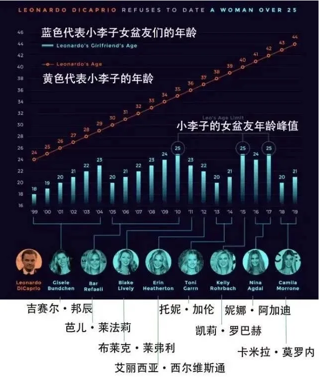 Reddit用户TrustLittleBrother仔细研究了小李子和他前女友们,他统计了小李子24岁到44岁间女友的年龄,封顶就是25岁超模Bridget Hall、《指环王》的精灵公主Liv Tyler、Kristen Zang、美国名模Amber Valletta、拍《海滩》的时候跟女主角Virginie Ledoyen谈恋爱。2000年,25岁,他终于脱离了年年换女友的节奏,小李子遇到了也许是他众多感情史中最接近婚姻的人物——巴西超模Gisele Bundchen(吉赛尔·邦辰)因为邦辰走秀时特有的那种强大气势,十分霸气,她在国内也收获了一个别称“吉娘娘”。莱昂纳多·迪卡普里奥,小李子达成了一个娱乐圈罕见的成就。作为一代顶流,他明明活着,还在营业,却已被无数人追悼过去。