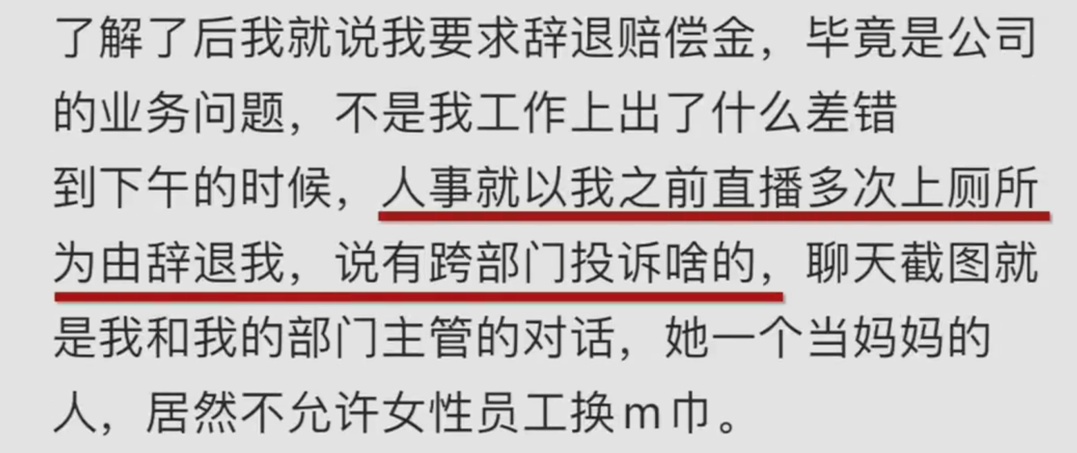 林女士称,当天自己因为生理期去了两三次厕所,就被公司以此为理由辞退,她觉得公司这是恶意辞退,公司方面称林女士不符合品牌方的要求,工作时间喜欢串岗,经常找不到人,建议她有诉求的话去仲裁。目前,林女士已经提起劳动仲裁。林女士是在试用期即将结束之际遭就职公司辞退的,2022年2月28日,她入职该公司,试用期3个月,原本应于5月28日转正。5月23日上午,公司的人事称因公司业务调整,要裁掉林女士。林女士索要赔偿金,人事表示没有。当天下午,人事又找到林女士,称她工作态度不积极,在一次直播外勤活动过程中多次上厕所,并以此为理由之一进行辞退,且不予赔付赔偿金。