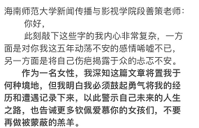 据爆料人所述,她和段某某是师生恋,年龄相差13岁,段某某在和她交往期间,先后与多名女学生暧昧不清,她曾向学院领导反映情况未果,于是愤而举报。如果爆料属实,段某某身为高校教师,不能洁身自好,爱护学生,而是将学校当成“猎爱场”,和崇拜仰慕自己的学生玩暧昧游戏,师德败坏,有辱斯文。目前学校已经介入调查,根据此前的类似事件,如果段某某的确违反了师德师风,那么一定会受到相应的处理。舆论发酵至此,没有哪个高校会承担着名声扫地的风险,去包庇师德有亏的教职工。