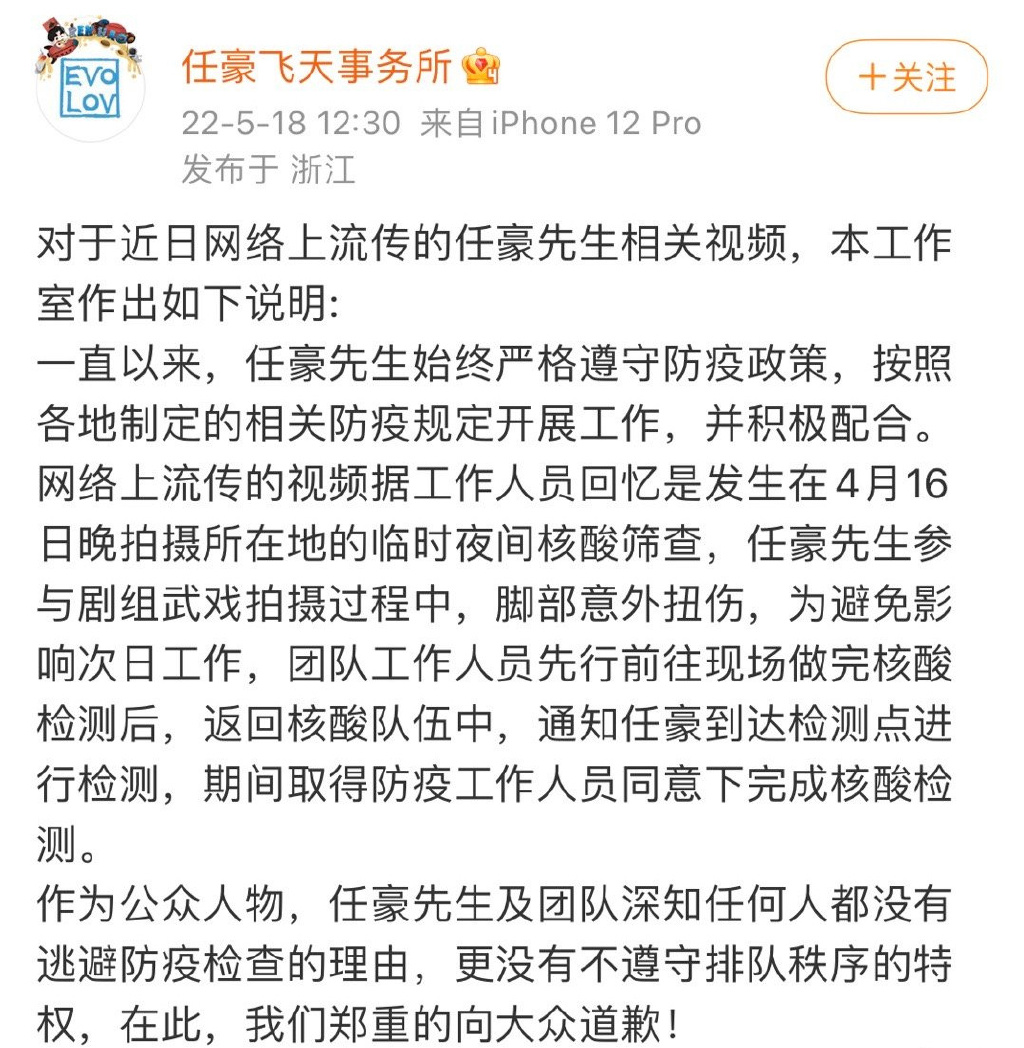 任豪不愧是专业演员,不管内心多么急躁和喜悦,脸上和脚步方面却丝毫没有凌乱,依然手插在口袋里,眼神清澈一步三晃,慢慢地把自己“融”进了队伍里,后面排队的小姐姐丝毫没有察觉前面多出了一个人,足见任豪的演技已经出神入化登峰造极了。可惜任豪没有察觉到,在助理给他打第一手势的时候,后面的一个姑娘就注意到了这两个人,在任豪把自己“挤”进队伍后,后面的这个姑娘再也忍不住,喊上前面的那个小姐姐,大喊你不要插队。18日,任豪飞天事务所发文回应称,任豪在拍戏过程中脚部意外扭伤,团队工作人员先行前往现场做完核酸检测后,返回核酸队伍中通知任豪到检测点进行检测,工作室道歉表示“任何人都没有逃避防疫检查的理由,更没有不遵守排队秩序的特权”。随后任豪_转发:“不找借口,真诚道歉”。堂堂大明星公然不遵守秩序的行为,让大家对于“公众人物”的印象,又有了几分改变。换成普通人,被人当众如此“指责”,想来面皮上一定早就挂不住了,或是灰溜溜地离开,再寻找下一次机会,或者是干脆转身道歉,说自己真的有急事,非常紧急,耽误一分钟就损失几百万的那种,希望大家原谅。