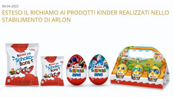 国际食品安全当局网络于4月10日发布了全球警报,启动了全球产品召回。海关总署提醒消费者,暂不通过任何渠道购买费列罗集团比利时阿尔隆工厂生产的上述产品。如有任何方式(包括各种渠道购买、赠予)获得费列罗集团比利时阿尔隆工厂生产的上述产品,立即停止食用,与原获得渠道联系退货事宜或与费列罗贸易(上海)有限公司联系。考虑到可能会有代购、海淘等非官方零售渠道,费列罗官方提示消费者,不要购买其在比利时阿尔隆工厂生产的任何批次、保质期和包装方式的品类为以下的巧克力产品——Kinder Mini EggsKinder SchokbonsKinder Surprise MaxiKinder Surprise也不要购买生产批号中带 “RZ、LZ、R03、L03” 的Kinder Suprise x6产品。