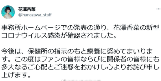 花泽香菜在推特确认感染新冠,原定于4月10日的演出也将取消。