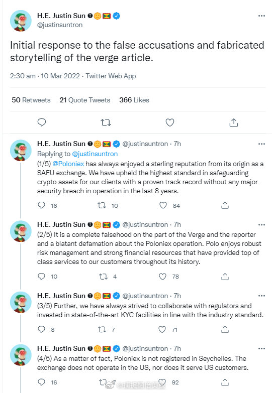 孙宇晨称:1、作为 SAFU 交易所,Poloniex一直享有良好的声誉。在过去 8 年中,我们在为客户保护加密资产方面保持了最高标准,并拥有良好的业绩记录,在运营中没有任何重大安全漏洞。2、这完全是 Verge 和记者的谎言,是对 Poloniex 运营的公然诽谤。 Polo 享有稳健的风险管理和强大的财务资源,在其历史上一直为我们的客户提供一流的服务。3、此外,我们一直努力与监管机构合作,并投资于最先进的符合行业标准的 KYC 设施。4、事实上,Poloniex 并未在塞舌尔注册。该交易所不在美国运营,也不为美国客户服务。5、作为格林纳达驻世界贸易组织代表,我努力在公共和行业领域的活动中坚持最高标准。我们保留对任何实体带来的虚假信息采取法律补救措施的权利。我们已聘请Harder LLP 作为我们的法律顾问。