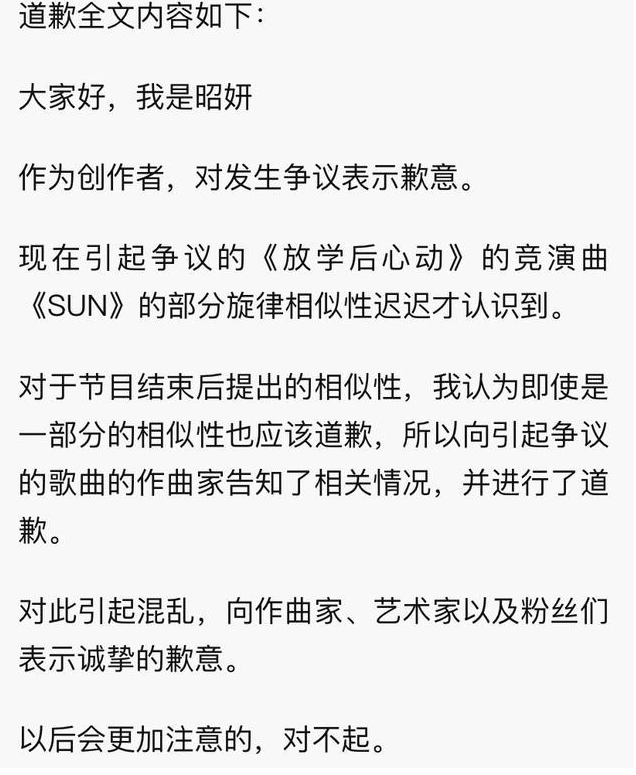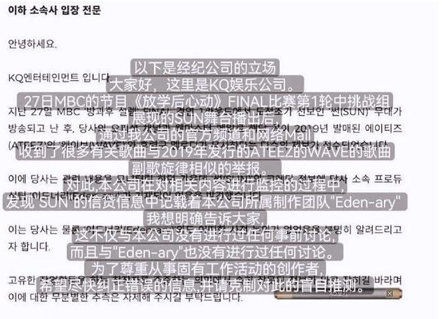 随后,词曲作者田小娟(全昭妍)就《放学后心动》final表演曲《Sun》与Ateez音轨相似道歉