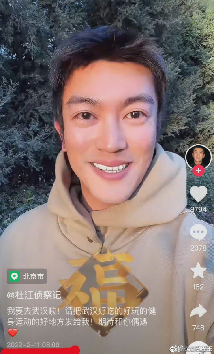 2月10日,网友投稿给娱乐博主。2月11日早上8点多,杜江发某音视频“请把武汉好吃好玩和健身的地方发给我吧!”