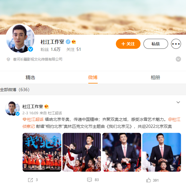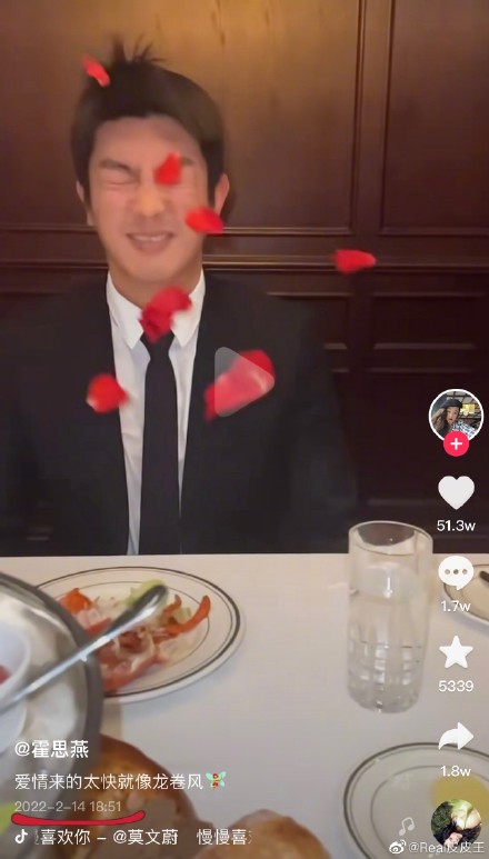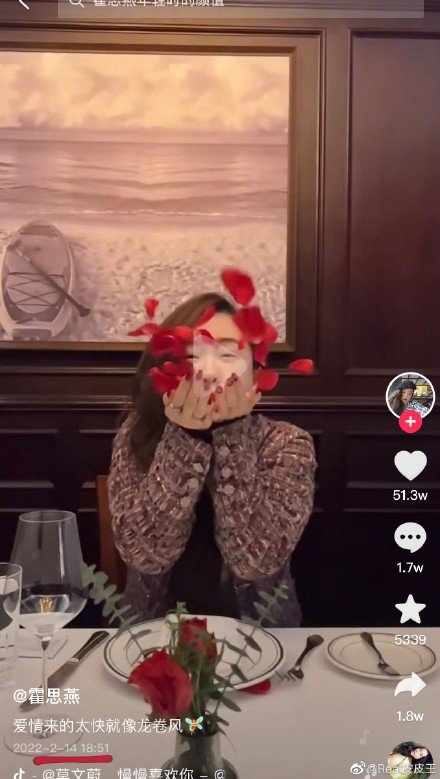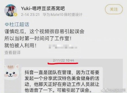 2月11日上午10点44分,粉丝私信询问工作室,杜江工作室回应称某音是团队在管理,因为杜江要分享武汉特色美食健身的活动,语音也是工作人员发的。2月14日傍晚18点51分,霍思燕发布情人节吹玫瑰花飞吻的视频,并配乐《慢慢喜欢你》,大秀恩爱。