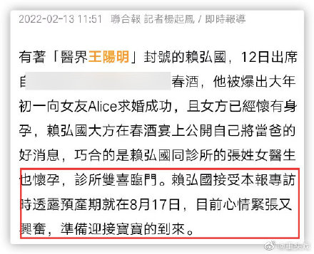 据台媒2月13日报道,阿娇前夫赖弘国在出席某活动时,大方承认自己即将当爸,并透露妻子的预产期就在8月17日。几天前台媒就曝出赖弘国向女友Alice求婚成功,并且女方已经怀孕的消息。12日,赖弘国在出席诊所酒会坦承了这件事,自曝Alice目前已经怀孕三个多月。