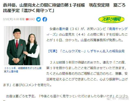 山里亮太所属事务所公布了其妻子苍井优怀孕的喜讯,目前已进入安定期,预计今年夏天生产。2019年6月,苍井优和山里亮太宣布结婚。