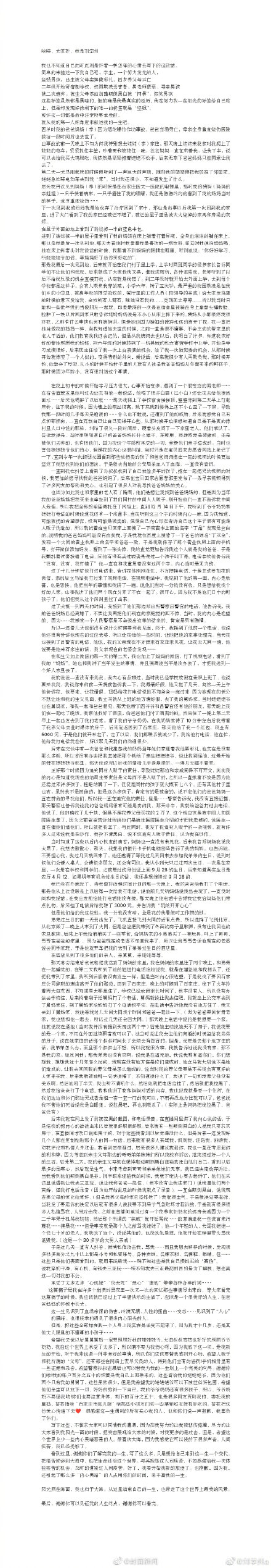 他曾在微博发布一条长文“生来即轻还时亦净”,还原了网上备受争议的“找亲生父母要房子”一事。他称和生母电话中说:“我想要的是一个家,她就说我在逼她。”和生父说:“我就是要一个住所,在我们这边和你们那边买或者租一套一室一厅的就可以。”最后的结果是“妈妈把我拉黑了,爸爸说我不管他们死活说我是白眼狼。”最后,刘学州说账户余额一半是上班积蓄,留给姥姥姥爷,账户另一半钱来自热心网友资助,他委托舅妈捐给“石家庄市孤儿院”,给那些小朋友们买一些漂亮的衣服和好吃的。