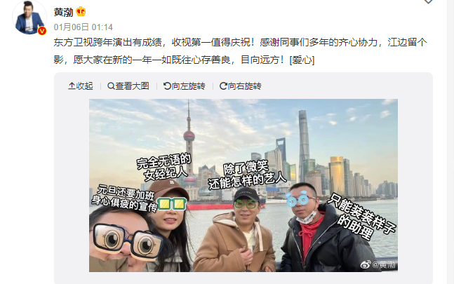 1月5日晚,黄渤和神秘女逛江边照爆出,期间女方给黄渤整理衣领,引发热议。6日凌晨,黄渤微博晒和工作人员合影,辟谣“出轨”传闻:“东方卫视跨年演出有成绩,收视第一值得庆祝!感谢同事们多年的同心协力,江边留个影,愿大家在新的一年一如既往心存善良,目向远方!”