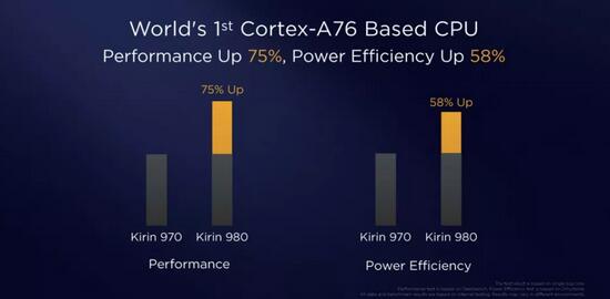 麒麟980在全球首次实现基于Cortex-A76的开发商用,相较上一代处理器在表现上提升75%,在能效上提升58%,满足用户对手机更快、更持久的体验需求。