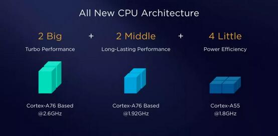 推出智能调度机制,创造性地设计了2超大核(基于Cortex-A76开发)、2大核(基于Cortex-A76开发)、4小核(Cortex-A55)的全新能效架构。相对于传统的大小核两档位设计,大中小核能效架构提供了更为精确的调度层次,让CPU在重载、中载、轻载场景下灵活适配,无论你是仅在发短信或是边打手游边听歌都能精确调度,大大降低了CPU在实际综合业务场景下的功耗,力求让用户获得更高性能体验的同时获取更长的续航体验,高性能、长续航两不误!