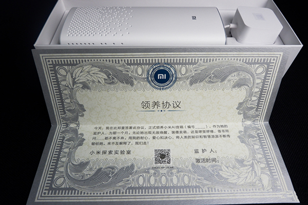 我们打开包装盒后可以看到,配件都是齐全的,各种说明书、参考书,还有一个电源适配器、主机,最可爱的是还有一张领养协议,真的非常有趣。