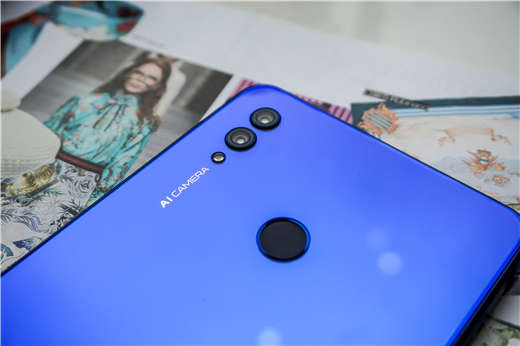 细节方面,背部的双摄像头、AI CAMERA以及荣耀Logo等元素横向有序排列,整体看上去简洁优雅。而圆弧形的边框与双面玻璃的过渡也非常自然,握持的手感十分圆润舒适。金属中框还采用了CNC工艺使其上下两侧均呈现出亮面效果,与背部的镜面蓝色玻璃相得益彰。指纹识别的位置也能够非常自然的用食指触碰到。