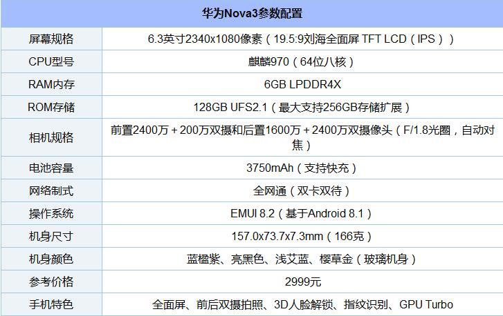 华为Nova3并没有短板,各方面规格都很高,尤其是前后都配备规格比较高的双摄像头,主打拍照特性明显。