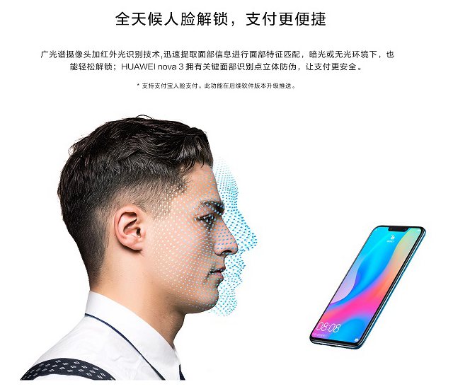 其它方面,华为Nova3支持3D人脸识别,相比普通的2D人脸识别技术,安全性更高,同时识别率更好。比如,华为Nova3支持全天候人脸解锁,还支持支付宝刷脸支付等。此外,还支持3D Qmoji AR动态表情,带来更多的趣味性。