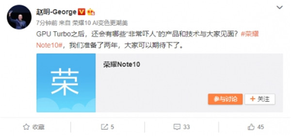 荣耀note10什么时候上市?荣耀note10上市时间?今天上午荣耀总裁赵明在微博意外宣布,此次将要推出新一代产品荣耀note10,一起来看看吧。