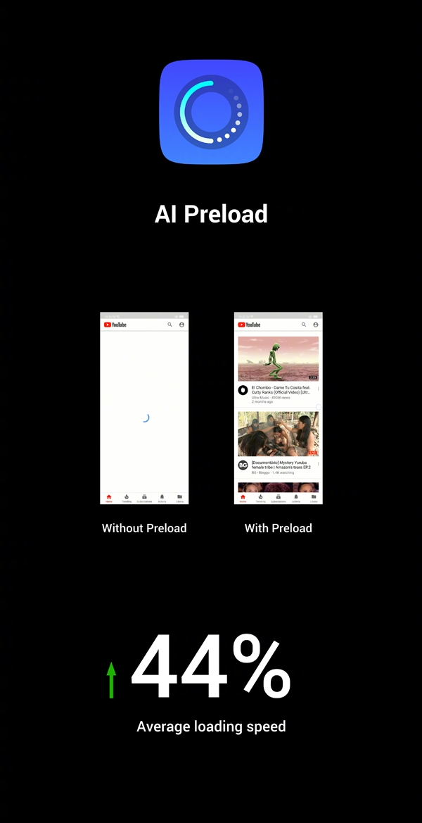 ColorOS 5.1会基于AI算法学习用户的使用习惯,预判接下来最可能打开的4个应用并预加载,使应用启动速度平均加快44%,而且随着手机使用时长的增长,会越用越准、越用越快。