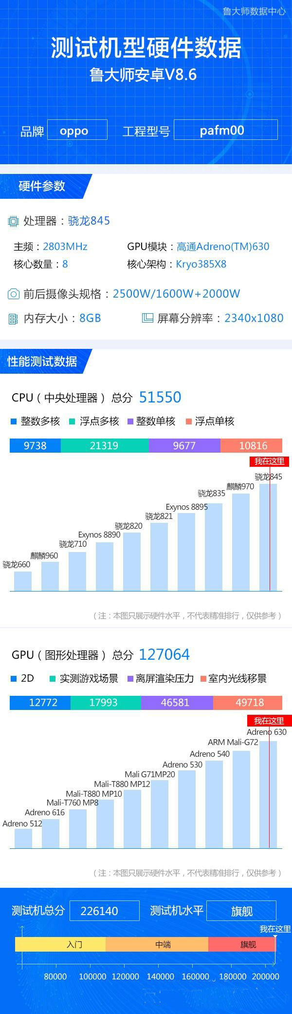 OPPO Find X的CPU(中央处理器)得分51550、GPU(图形处理器)得分127064、总分226140。对比市面上搭载骁龙845的手机,OPPO Find X的CPU跑分和GPU跑分都有着不同幅度的领先,但整体性能差距不大。