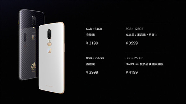一加6的6GB+64GB版亮瓷黑3199元;8GB+128GB版全配色3599元;8GB+256GB版墨岩黑3999元。将在5月22日10:00起一加官网、京东全速开售!一加6漫威复仇者联盟限量版4199元限量发售!月牙白将于6月5日开售。