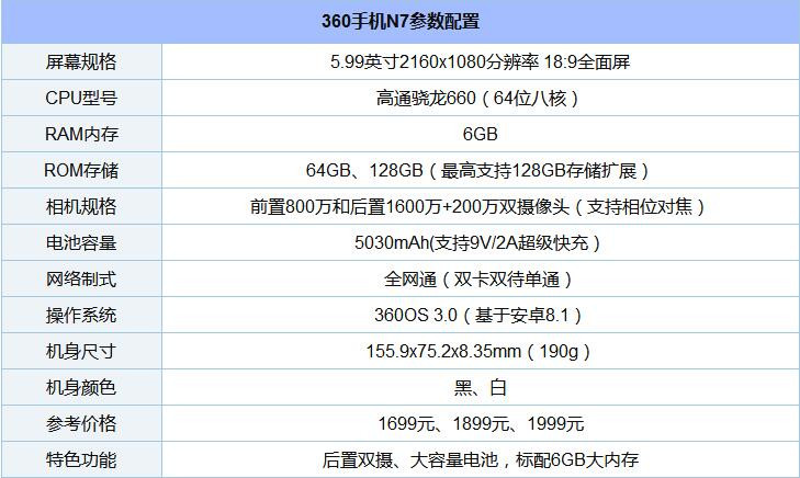 硬件配置方面,360手机N7采用了5.99英寸全面屏设计,搭载了高通骁龙660处理器,标配6G大内存,主打高性能大内存。配备前置800万像素摄像头+后置1600万+200万像素摄像头,内置5030mAh容量电池,支持快充,预装360 OS 3.0系统,具体的参数规格如下。