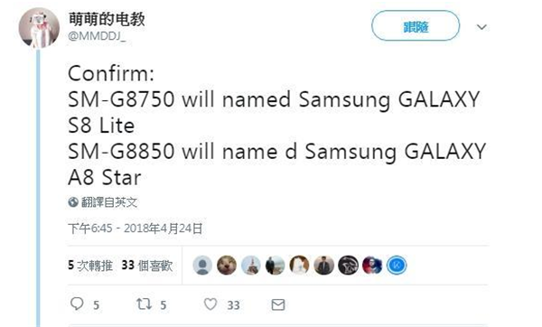 有消息指出,SM-G8850 产品正式型号为 Galaxy A8 Star,是 Galaxy A8 (2018) 大屏幕双镜头升级版。中国工信部揭露的产品资讯被发现有所调整,整体规格比先前曝光时有不少变动,配置 6.28 吋 2,220 x 1,080屏幕,采用 2.2GHz 或 1.84GHz 八核心处理器,传为 Qualcomm Snapdragon 660或是 SAMSUNG Exynos 7885 处理器。