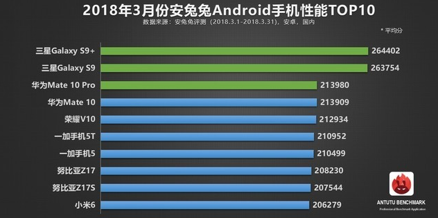 结果还是很明显的,3月份安卓手机性能第一宝座绝对要属于三星S9+了,与排名第二的Galaxy S9相同,两者国行版本均搭载高通骁龙845移动平台,最高主频2.8Ghz。二者相差并不是很大,三星S9+采用的为6GB内存,而三星S9则是4GB内存,所以差距就体现在了这里。