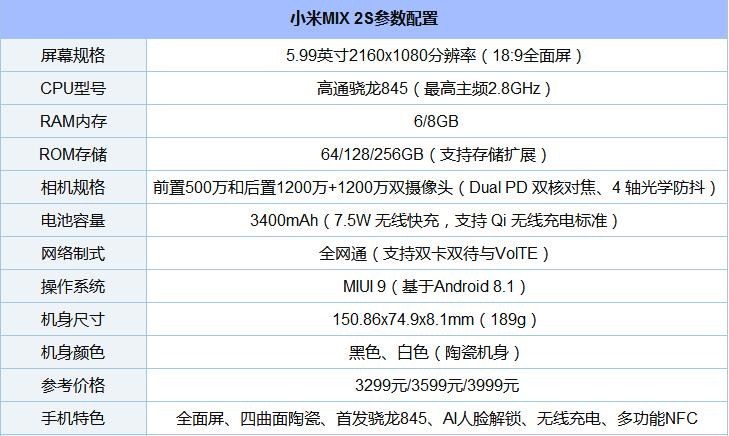 小米MIX 2S将提供6GB+64GB、6GB+128GB、8GB+256GB三种存储规格可选,售价分别是3299元、3599元、3999元,将于4月3日米粉节期间正式开售。