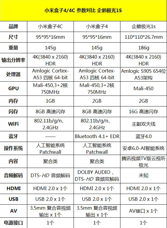 参数 报价 图片 对比 评测导购 小米盒子4C配置:4K(3840 x 2160) HDR、Amlogic Cortex-A53 四核 64-bit 1.5GHz、Mali-450,3+2核 750MHz、1GB内存+8GB闪存,不支持蓝牙、支持HDR H.265、小米红外遥控器……
