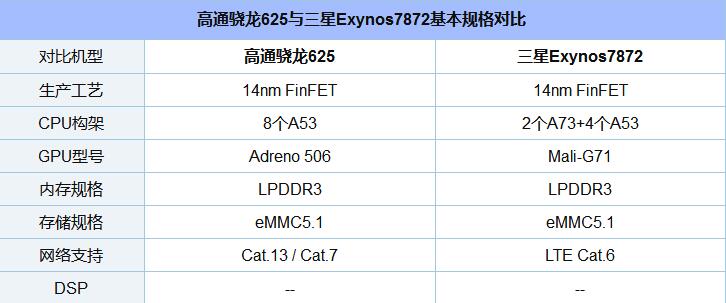 通过参数对比得知,高通骁龙625搭载自家的Adreno 506图形处理器,而三星Exynos7872则是Mali-G71,进而注定二者图形处理能力的差异。高通骁龙625的优势则在于LTE网络,最高可支持Cat.13,数据传输速度更快。