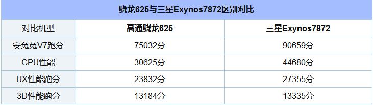 以上就是三星Exynos 7872和高通骁龙625的区别对比,就跑分性能来说,Exynos 7872显得更有优势,高于骁龙625,基本与骁龙630跑分相当。不过,这款处理器可能也存在一些不足,比如不支持双摄、高分屏,未来还有待提升,短期内要打败高通经典神U骁龙625似乎仍存在一些短板,未来表现如何,就交给市场和时间去检验吧。