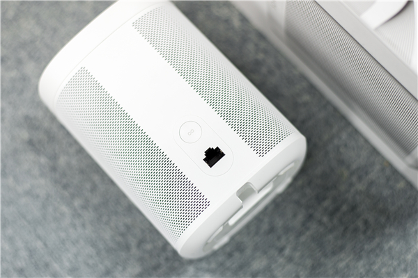 底部是嵌入式的电源接口。这样的电源接口能够很好地隐藏线缆。同时,SonosOne并没有没有内置锂电池,依旧是电源供电,也就意味着它可能绝大多数时间会摆放在一个固定的位置。背面则是网线接口,紧挨在网线接口上方的则是网络配置按键,让SONOS ONE能够接入网络,从而实现一系列的网络功能。