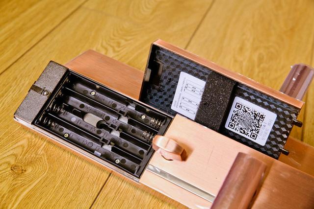 小嘀云智能锁的电池仓设计在防盗门内侧一方的门把手套件上,采用滑盖开启的方式来打开。