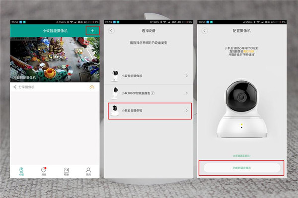 下载安装好小蚁摄像这个应用程序以后,我们就可以进行绑定小蚁云台摄像机的步骤了。绑定的方法也非常简单,我们点击首页右上角的添加按键,然后在选择设备列表里面找到我们需要绑定的小蚁云台相机。